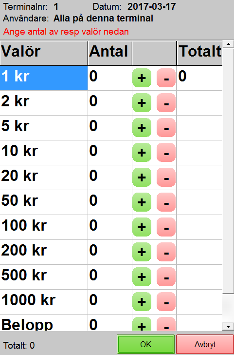 Om funktionen Räkna kassa ska användas, tryck på den knappen. I fönstret (se bild nedan) fyller man i hela kassalådan. Mata in antal valörer. Detta inkluderar ingående växelkassa.