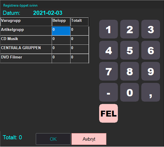 Fyll i totalt belopp för svinnet för respektive varugrupp under kolumnen ”Belopp”. Tryck [OK] när allt är ifyllt. Detta görs med fördel löpande under dagen. Nästa gång svinn-fönstret öppnas kommer det totala beloppet för respektive varugrupp stå under ”Totalt” och ”Belopp” kommer att adderas till detta.