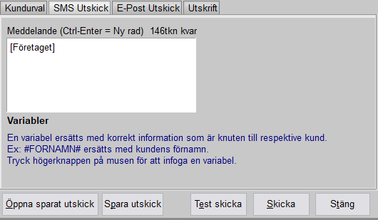 Högerklicka i fältet för att få upp variabler. Dessa används till exempel för att automatiskt skriva rätt kunds förnamn. #FORNAMN# ersätts alltså med kundens förnamn. Olika antal tecken kommer att användas för respektive SMS då variabler används. Man kan se hur många tecken det är kvar i meddelandet men det kan inte ta hänsyn till variabler då dessa är unika för respektive kund.