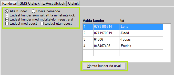I första fliken, ”Kundurval”, väljer man de kunder man önskar göra utskick till.