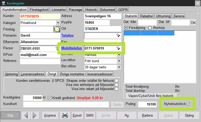 För att markera en kund godkänd för nyhetsutskick öppna istället kundregistret via menyn "Register/Kundregister/Kundregister" och öppna upp relevant kundkort genom att söka fram och dubbelklicka på denna i listan. Mobiltelefon ska vara angivet i fältet för detta för att SMS-utskick ska fungera och kryssrutan "Nyhetsutskick" behöver vara ikryssad och godkänd av kund för att denna ska följa med till urvalet.
