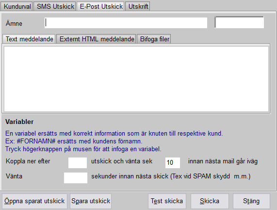 Tredje fliken, ”E-post Utskick”, fungerar som SMS Utskick. Man kan dock ha mer text. E-post kräver dock att epostleverantören klarar av att hantera stora mängder e-post (massutskick) vilket vanligtvis är förenat med betaltjänster. Undersök vad som gäller hos er e-postleverantör.