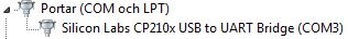 Har Windows redan rätt drivrutin så visas en Silicon Labs enhet under Portar (Com och LPT) som på bilden. Notera vilket COM nr enheten har längst till höger. I visningsexempel COM3.