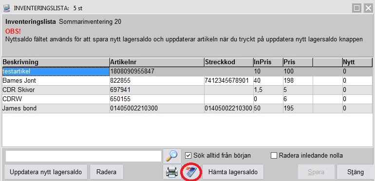 Hittas varor under inventeringens gång som inte finns registrerade i kassan och därför inte i inventeringslistan så är rekommendationen att skapa artiklarna som vanligt i kassan och att ange lagersaldo när dem skapas. När man sedan är klar med inventeringen och uppdaterat kassan med inventeringslistan kan man skriva ut en lista med totalt lagervärde i kassan.