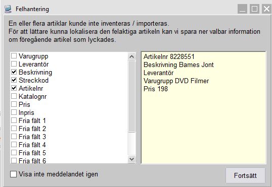 Nu visas en felrapports textfil. Här visas en rad för varje fel. Om en och samma streckkod har scannats flera gånger som inte finns i listan så kommer det på egna rader för varje tillfälle.