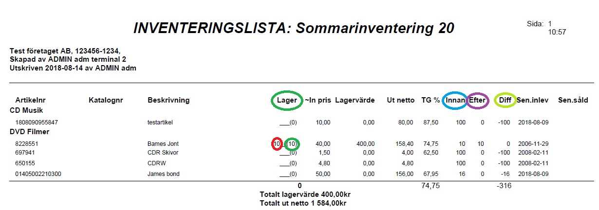 Innan = Lagersaldot som var i kassan när man tryckte knappen skapa inventeringslista.