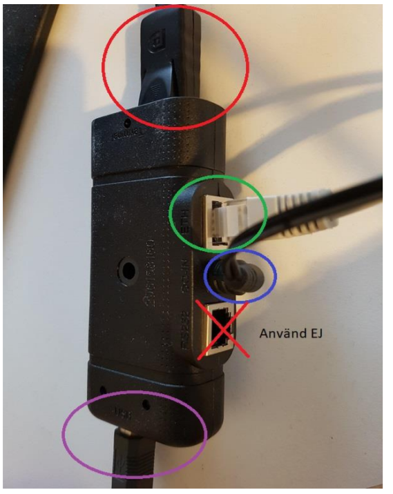 Nätverkskabel till bredbandsrouter / swish i grönmarkerad kontakt.