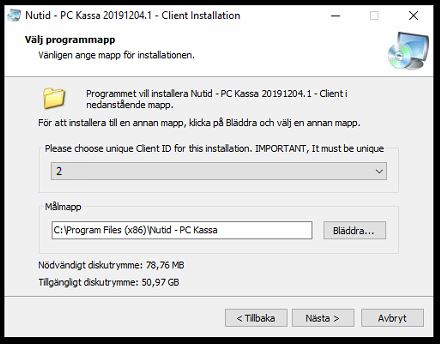 Sökvägen/Målmapp låter vi stå och vid frågan om att ange "Client ID" väljer vi ett unikt ID-nummer för denna klientkassa.