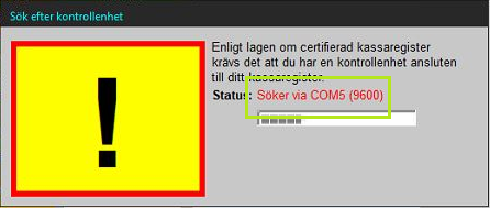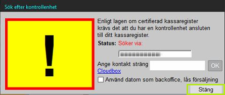 PC-Kassa söker efter kontrollbox automatiskt vid uppstart. Om avsikten är att koppla in boxen senare eller om man av annan anledning vill avbryta sökningen går detta bra. Antingen låt sökningen bli klar (tar ibland ett par minuter) eller dubbelklicka flera gånger på den röda texten "Söker via ..." för att avbryta sökningen.
