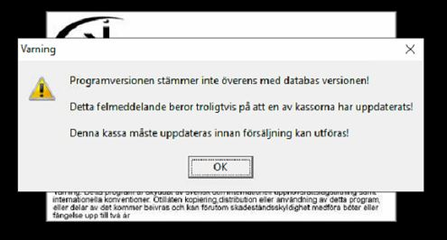 Tips! Om man missar att bocka av Starta PC-Kassa i installationens slutfas eller råkar att starta PC-Kassa innan uppdateringen mot rätt (fiskal / ej fiskal) version är gjord möts man av följande fönster.