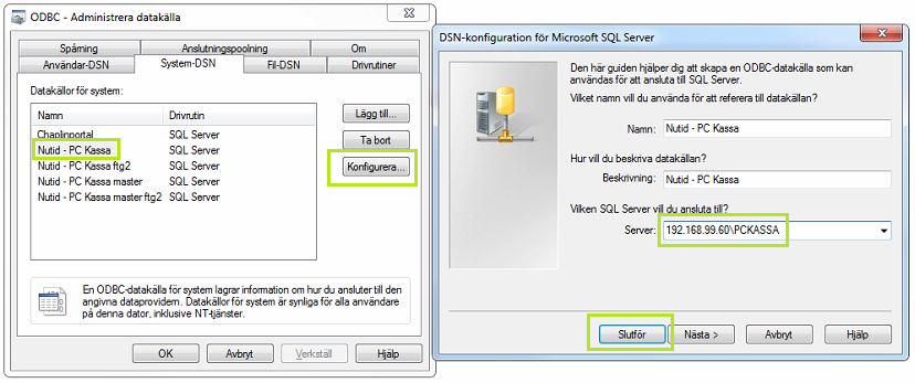Öppna fliken System-DSN, Välj Nutid - PC Kassa och tryck Konfigurera. Säkerhetsställ i fältet Server att uppgifterna mot huvudkassan är korrekta. Slutför.