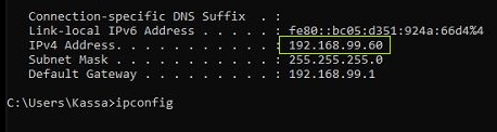 Notera IP-adressen då denna kommer att användas senare. I detta exempel arbetar vi mot 192.168.99.60 som är "Huvudkassans" IP-adress. TIPS: Om IP-adress ska användas bör denna vara satt som fast IP.