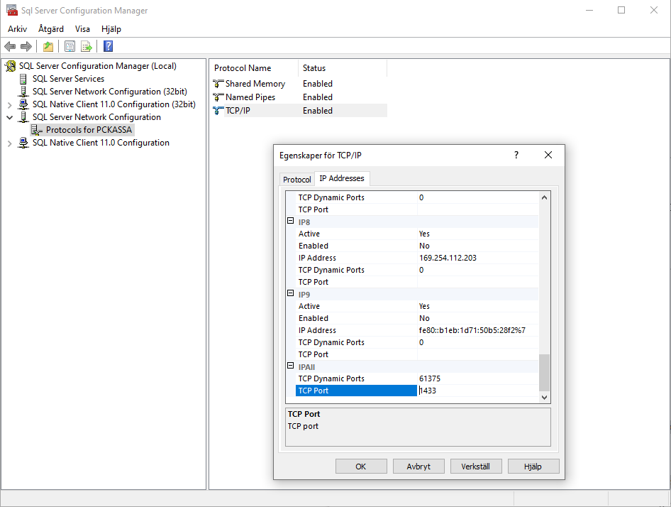- Ändra SQL port på HK från Dynamisk till fast port 1433 (SQL Server Configuration manager)