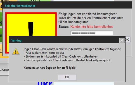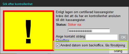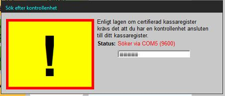 När kassaprogrammet startar möts man av fönstret för sökning efter kontrollbox. Antingen låt sökningen bli klar (tar ibland ett par minuter) eller klicka på den röda texten "Söker via ..." flertalet gånger för att avbryta sökningen.