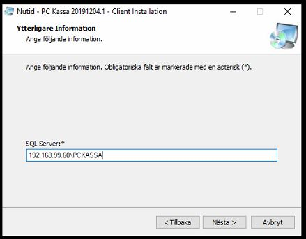 Under installationsflödet kommer man behöva ange "adress" till själva SQL-servern (Databasen / Huvudkassan). Det normala är att denna går antingen mot huvudkassans Datornamn eller huvudkassans IP-adress följt av "\PCKASSA". I vissa lägen används instanser av PCKASSA likt PCKASSA1, PCKASSA2 vilket då denna pekas mot önskad instans av kassaprogrammet. Men det mest normala är att sökvägen till huvudkassan anges som XXXXX\PCKASSA vilket vi arbetar efter i denna guide.