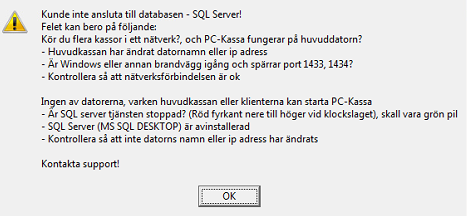 Möts man av meddelande om att Databasen - SQL-Servern inte kan nås kan detta bero på att kommunikationen mellan backofficedatorn och huvudkassan inte accepteras. Kontrollera brandväggar och andra nätverksregler då SQL-kommunikation måste vara accepterad för att backofficedatorn ska kunna koppla upp sig mot huvudkassan. Kontrollera också så att inställningarna för IP-adress eller Datornamn är korrekt.