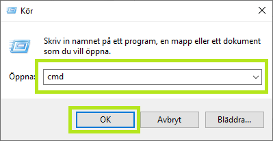 Ange "cmd" (Kommandotolken) i "Kör"-fönstret och tryck "OK" eller Enter på tangentbordet.