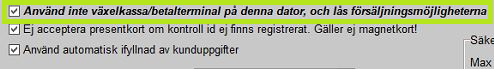 - Logga in i kassaprogrammet och stäng av sökning efter kontrollbox samt stänga av registrering av växelkassa