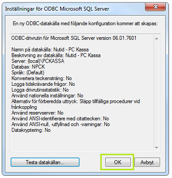 Slutför och tryck [OK] i fönstret Inställningar för ODBC