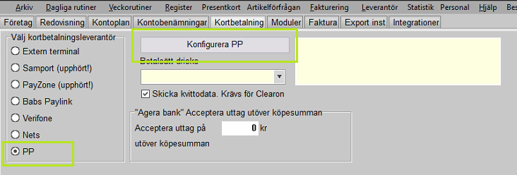 Öppna PC-Kassa och gå till menyn Arkiv - Inställningar - Företagsuppgifter - Kortbetalning.