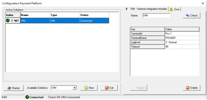 Tryck på knappen Register. Om anslutningen lyckas får ni Connected, Check OK VIM Connected.