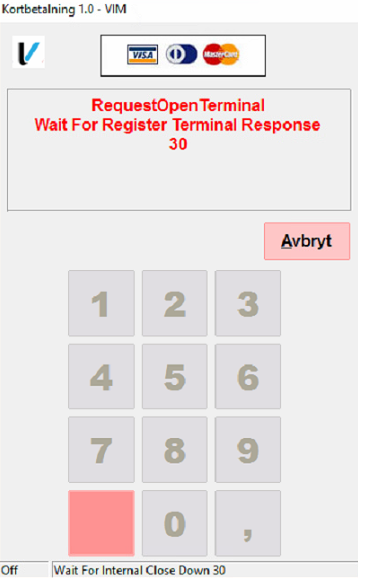 Kontrollera att det står ”Terminal redo” samt ”Väntar på anslutning till kassan” i displayen. Starta om terminalen genom att dra ut strömkabeln från adaptern om detta inte syns. (Håll inne röd knapp i 7 sekunder och sedan Grön knapp för att starta upp.)