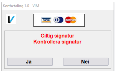 Signaturköp finns inte längre som ett val i kortterminalerna men när man drar kort med magnetkort från ett ej europeiskt land så aktiveras det (Finns undantag om kundernas inlösare godkänner det som t.ex. Resursbank kort). Kunden godkänner beloppet i terminalen och sedan skrivs det ut ett signaturkvitto från kvittoskrivaren. Slutkunden signerar och sen väljer kassören som på bilden nedan om signaturen är godkänd. Vid JA så slutförs köpet. Vid NEJ så avbryts köpet