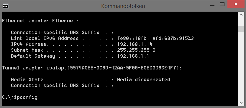 Tips! Ta fram datorns IP-adress genom att gå på Windows Start-menyn och kör programmet cmd.exe. Mata in "ipconfig" och tryck enter. I exemplet nedanför är datorns IP-adress 192.168.1.14.