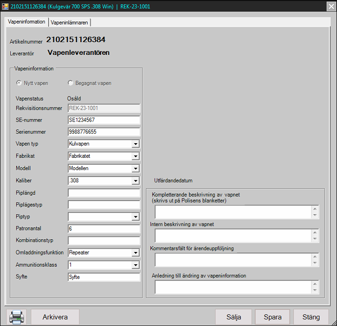 - Registrera ett Vapen (beskrivning, artikelnummer, pris mm.)
