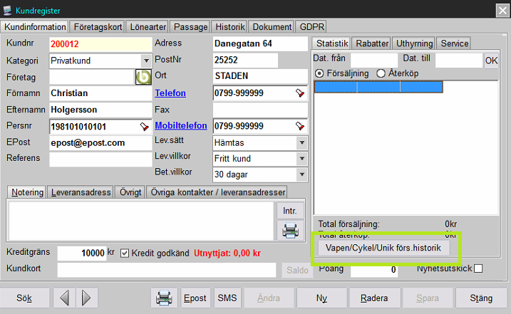 Det finns flera sätt att söka fram historik. Till exempel via kundregistret i kassan. Sök fram och välj kund i listan samt tryck på knappen Vapen/Cykel/Unik förs.historik på det unika kundkortet.