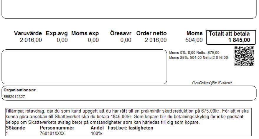 Exempel på en faktura där rotavdrag är tillämpad.
