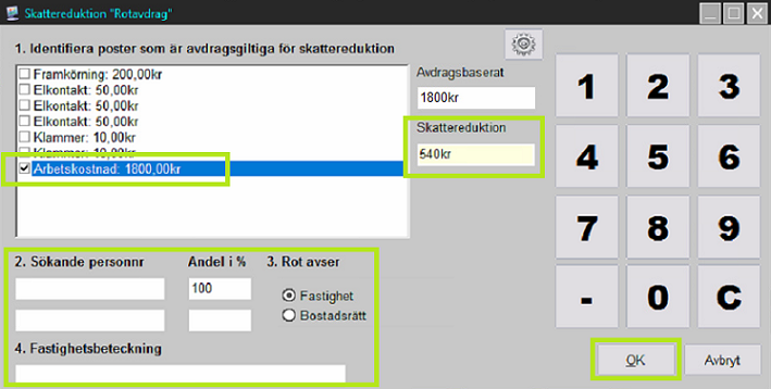 Slå in inslagen på kvittot och separera de artiklar som är avdragsgrundande. Tryck på den nya knappen för ROT-Avdrag.
