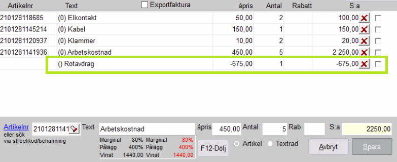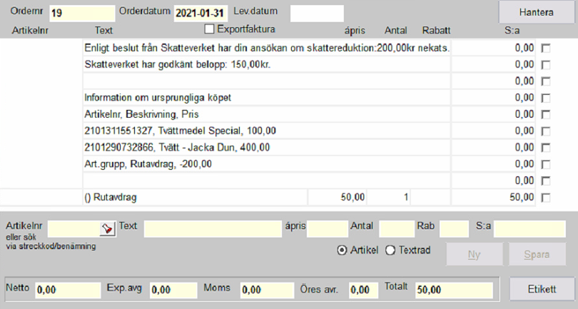 Skapa en manuell order eller faktura som vanligt. Registrera de artiklar och tjänster som skall faktureras och tryck sedan på knappen Skattereduktion längre ner i Fakturafönstret.
