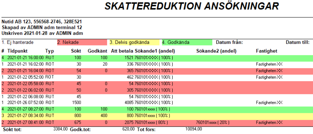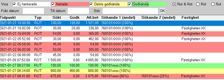 I detta fönster möts vi av samtliga utslag som gjorts med RUT- och ROT-avdrag. Det går bra att göra urval på olika premisser och utskrifterna som kan göras speglar urvalen. I nedre delen av fönstret ser vi en tydlig överblick över försäljningen samt de avdragsgrundande inslagen och här framgår även om det är kvittoförsäljning eller fakturaförsäljning. Det går också att markera ansökningar som godkända, nekade eller delvis godkända för en tydlig bild över vad som behöver hanteras.