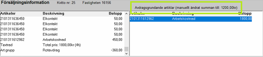 Den nedre vänstra rutan visar innehållet ur den markerade försäljningen och den nedre högra rutan visar de artiklar som är avdragsgrundande på aktuell försäljning.
