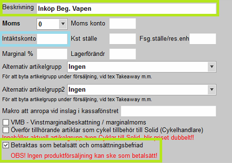 OBS! Det är mycket viktigt att rutan "Betraktas som betalsätt och omsättningsbefriad" är markerad på en artikelgrupp som ska fungera som ett betalsätt.