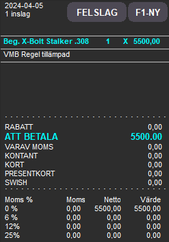 Försäljningen av ett begagnat vapen sker på samma sätt som försäljning av nytt vapen genom att söka fram eller välja vapnet via vapenboken och välja eller upprätta kund till köpet. Skillnaden är att informationen om VMB-tillämpning automatiskt infogas på kundens kvitto och systemet räknar ut beskattningen på kassarapporten enbart utifrån vinsten.
