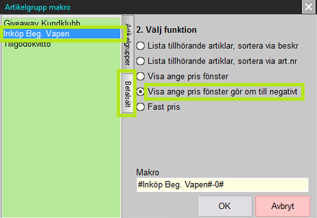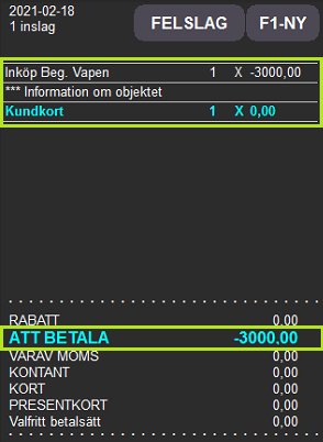 För att kunna betala ut pengar till en kund mot ett inköp av en vara behövs ett betalsätt för detta. Namnge betalsättet "Inköp Beg. Vapen" eller liknande för enkel uppföljning. Detta betalsätt registreras på samma plats som vanliga artikelgrupper men skillnaden är att detta markeras som ett betalsätt. Ett betalsätt är omsättningsbefriat och påverkar alltså inte försäljning i kassan. Lagerförändringen sker när vapnet senare levereras in.