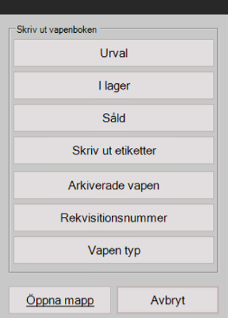 - Skriv ut etiketter, möjlighet att skriva ut etikett direkt ifrån vapenboken. För ytterligare information om denna funktion, se separat dokumentation.