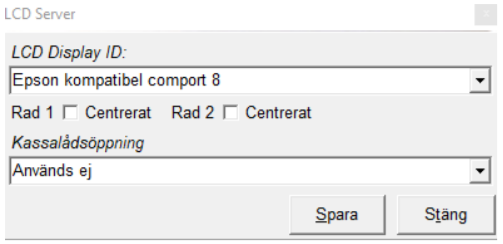 Om kassalådan styrs via VendoPRO/datorn bör den konfigureras att köras via denna programvara. Ställ in på fliken Kassalåda, samma ID som ovan: LCD Server