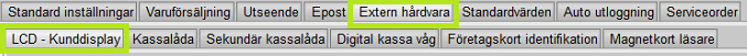 För att komma åt kassainställningarna för LCD-kunddisplay gå via menyerna Arkiv - Inställningar - Systemuppgifter - Extern Hårdvara - LCD - Kunddisplay