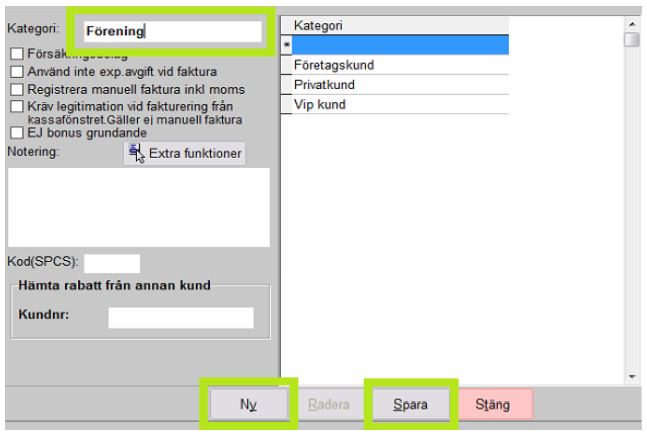 Tryck därefter på knappen [Ny] och fyll i namnet på kategorin (exempelvis Förening) i fältet Kategori. Slutför genom att trycka på knappen [Spara] och stäng därefter fönstret.
