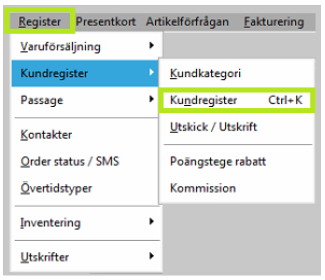 Förbered de föreningar där medlemmar kan komma att handla i butiken genom att registrera dessa i kassans kundregister. Om kundregistret ska användas till vanliga kunder går det också bra att registrera kunden vid tillfället när de besöker butiken för att handa. För att komma åt detta, öppna menyn Register - Kundregister - Kundregister.
