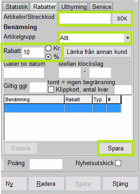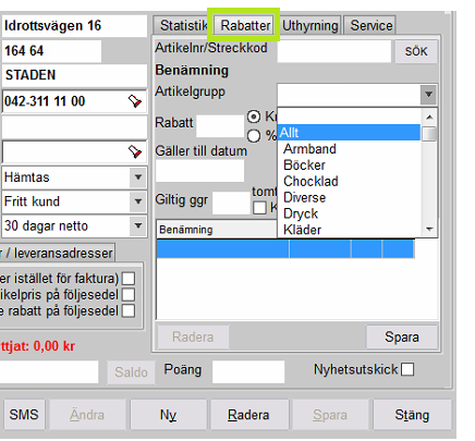 För att justera eller radera en rabatt markera denna i listan och välj att justera i fälten eller radera genom att trycka på knappen [Radera].