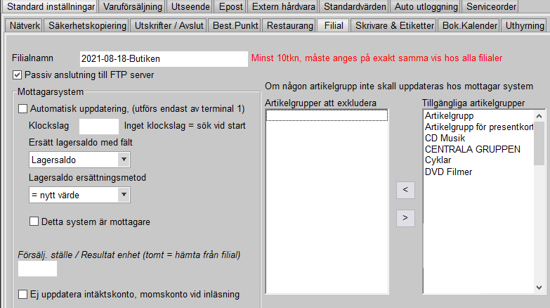 Filialnamn måste stå EXAKT som i den kassan det skickas ifrån. Gör det inte det så kommer ingen filialuppdatering att hittas.