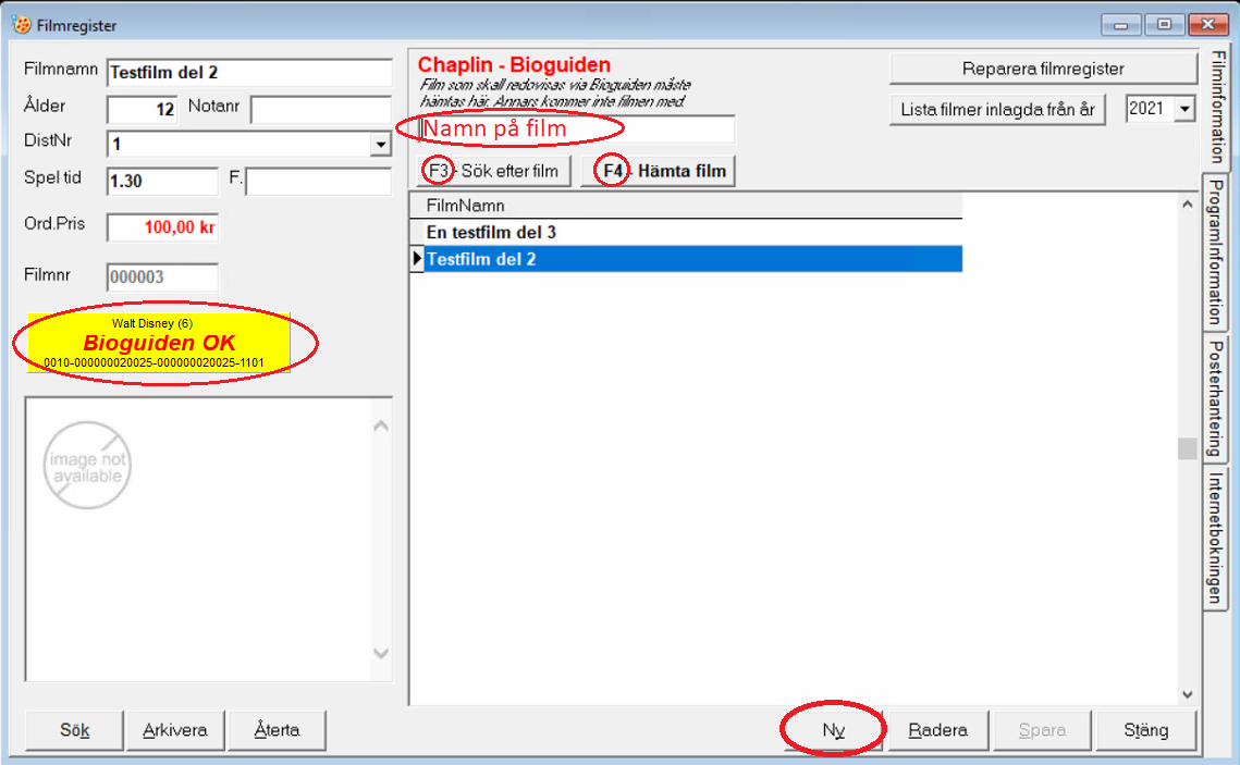 För att skapa eller hämta en film så behöver man gå in i filmregistret Register->Filmregister