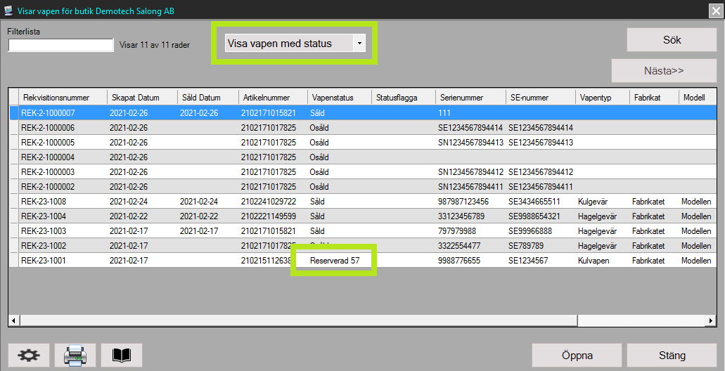 Tänk på att välja att även visa reserverade vapen i rullistan "Visa vapen med status" då detta inte längre har status "Osålt".