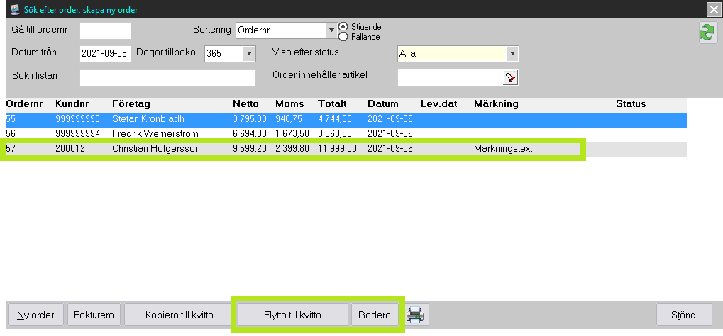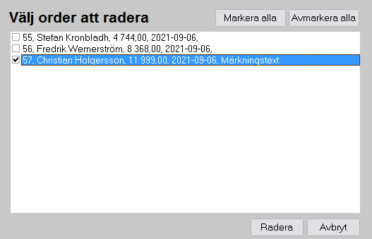 För att radera en order helt, använd knappen "Radera" i orderlistan och markera därefter den eller de order som ska raderas.