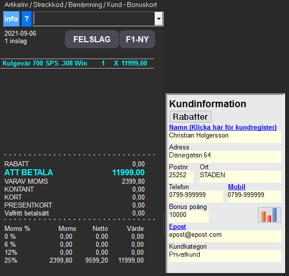 Ange och registrera som vanligt kundens uppgifter när fönstret för detta öppnas och låt därefter inslaget ligga kvar i kvittofönstret.