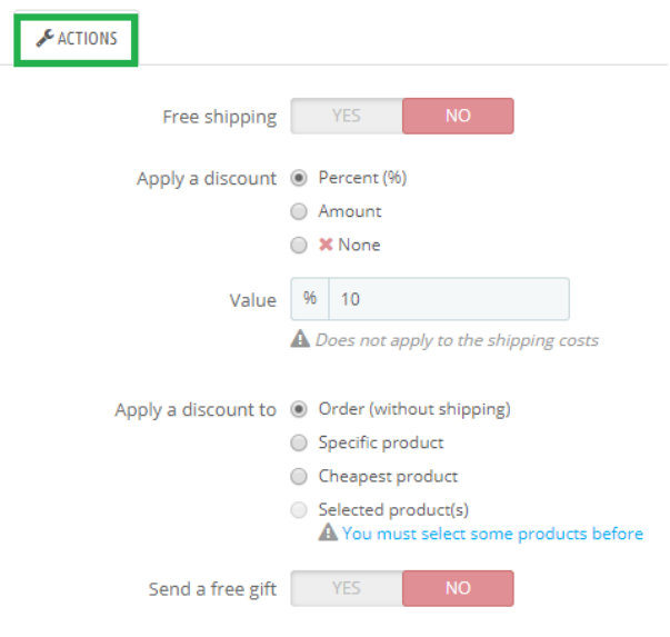 Slutligen ska vi tala om vad som ska hända när kampanjkoden och villkoret för kampanjkoden uppfylls. Detta gör vi under "Actions". Här kan vi tala om att det ska röra sig om gratis frakt och därefter bestämma om vi ska rabattera i procent (percent%) eller i krona (amount). I vårt exempel har vi valt 10% rabatt på hela ordern. Här går det alltså att välja om man vill att rabatten ska appliceras på hela ordern (exklusive frakt) eller på en specifik produkt (specifik product), den billigaste produkten (cheapest product) eller på de produkter vi valde tidigare (selected products).